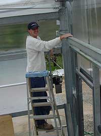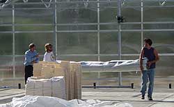 John Pade (left) with John Vittands (middle) and Zach Mayer (right) carrying the greenhouse roof panels.