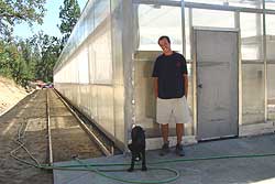 Shaun  Strickland outside of the greenhouse where the cement pad for the cool and cold rooms has been poured and the sidewalks  have been framed out.