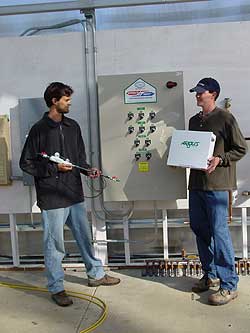 The Argus Controller is onsite and ready to be installed. This awesome system provides unprecedented monitoring, control and manipulation of the environment, heating, cooling, the retractable roof and walls, nutrient injection and more. In the photo on the right, Zach Mayer (left) holds the pH probe for the fish tanks and Shaun Strickland (right) holds one of the controllers as they discuss the installation of the system. The staff of Argus Controls, Inc., especially Eric Baumann and Jeff Neff, have been exceptionally responsive and designed, built and delivered the components within two weeks. Thanks guys. |